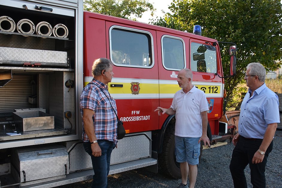 Ortstermin am Montagabend am Bauhof in Großeibstadt. Kommandant Michael Hesselbach (Mitte) stellte Klaus Höhn, Vorsitzender der Humanitären Ungarnhilfe Hl. Elisabeth Hohenroth, das ausgemusterte Feuerwehrauto vor. Mit dabei Bürgermeister Emil Sebald, denn Eigentümer des Fahrzeugs ist die Gemeinde Großeibstadt und hier hat der Gemeinderat ohne Gegenstimme zugestimmt. Foto: Friedrich